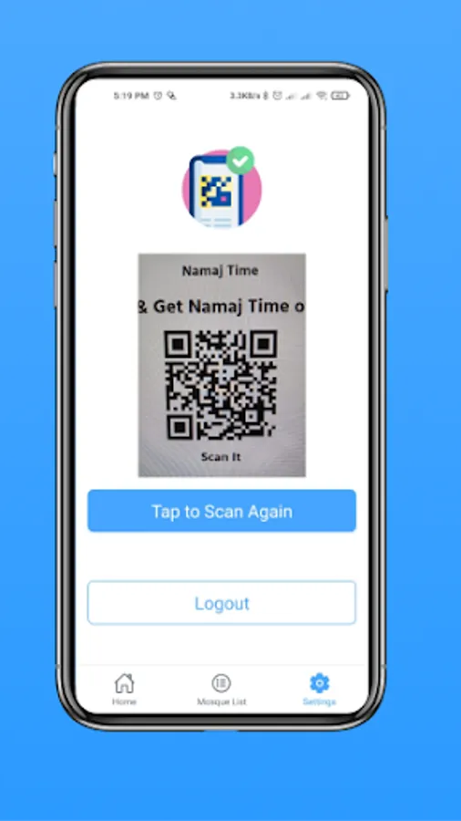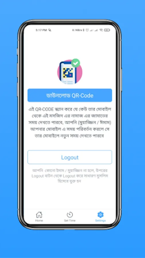 3. After that, download the QR Code of your mosque from the settings, print it and send it to the mosque. Any devotee can check the time from the app by scanning the QR code.