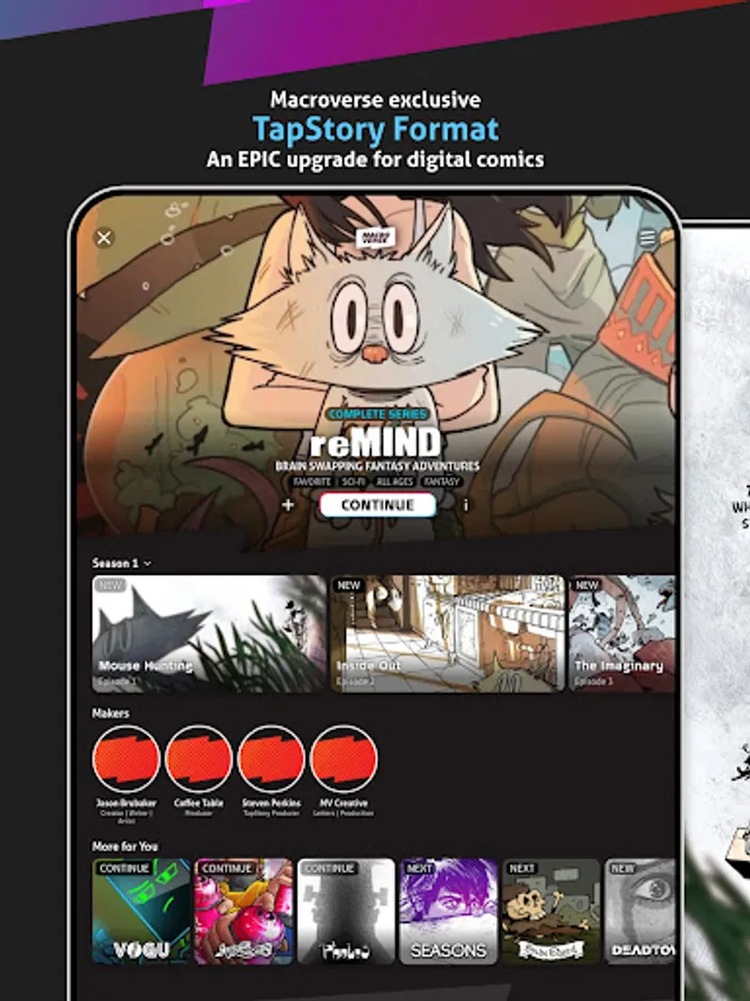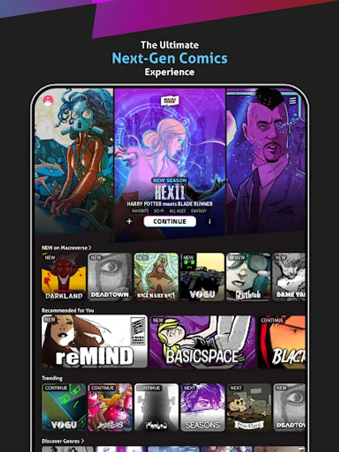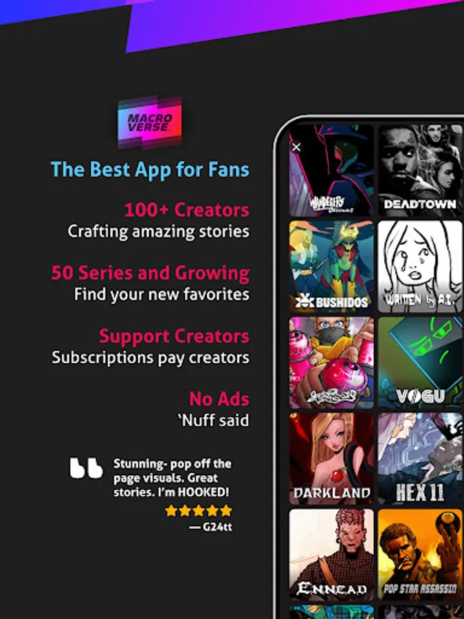 Macroverse is a new type of comic and webtoon! Our unique TapStory format delivers stories that feel completely native on your phone. It's the way comics would be if they were invented today. If you love comics and webtoons, you'll love this. If you've never read them... you'll love this!