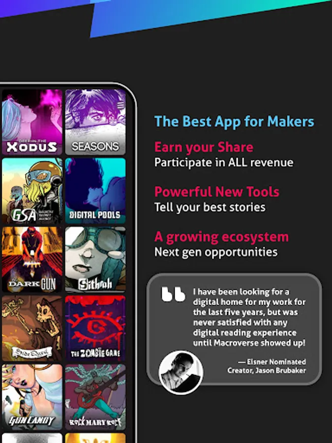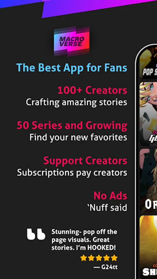 Enjoy a wide range of free episodes and exclusive series and subscribe for unlimited access to EVERYTHING for one low price. Better yet, Macroverse is built with and for the creators that make the stories you love. All subscription revenue is shared directly with the creators who make the comics on our app. Subscribing to Macroverse directly supports the next generation of comics creators and helps them make more great work for you to enjoy. See how great that is!