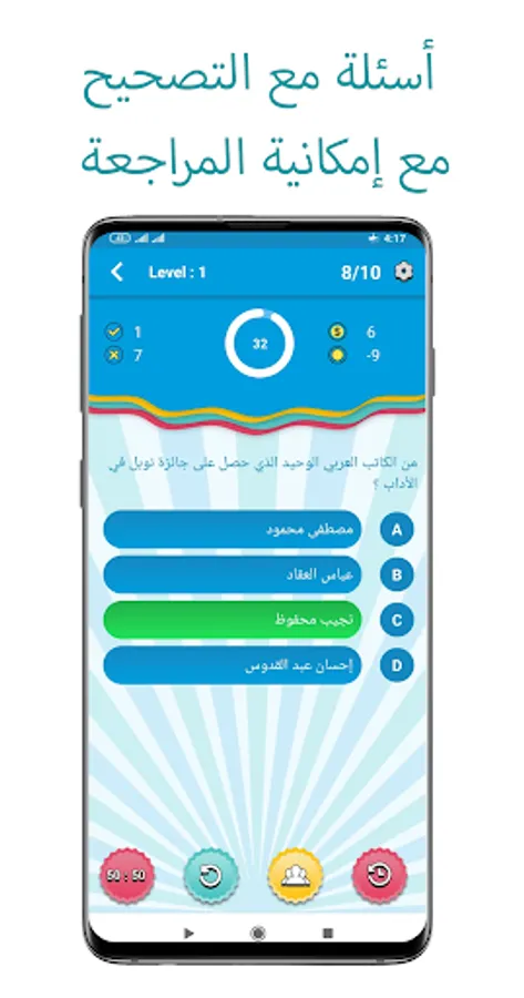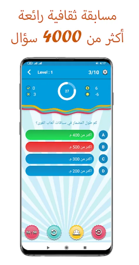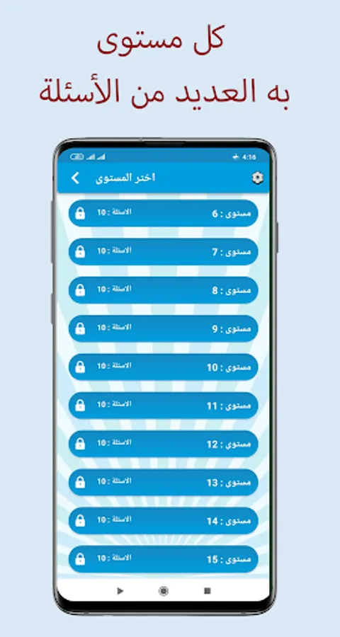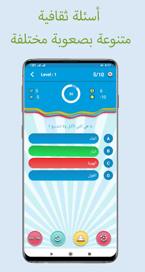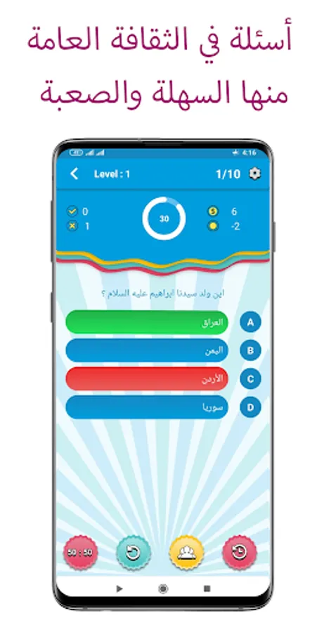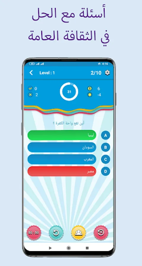 A general cultural questions and answers game without the Internet in general information: It is a game that includes a large number of general questions and cultural, religious and political questions. The game of general cultural questions and answers without the net includes general information many stages, each stage has 10 questions and the player must pass At least 80% to move to the next stage, depending on your general culture and means of assistance.