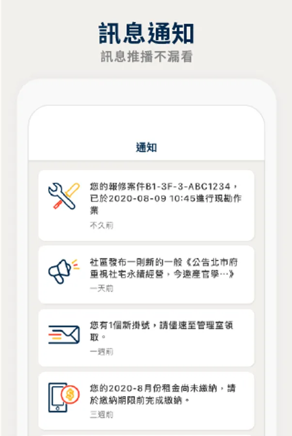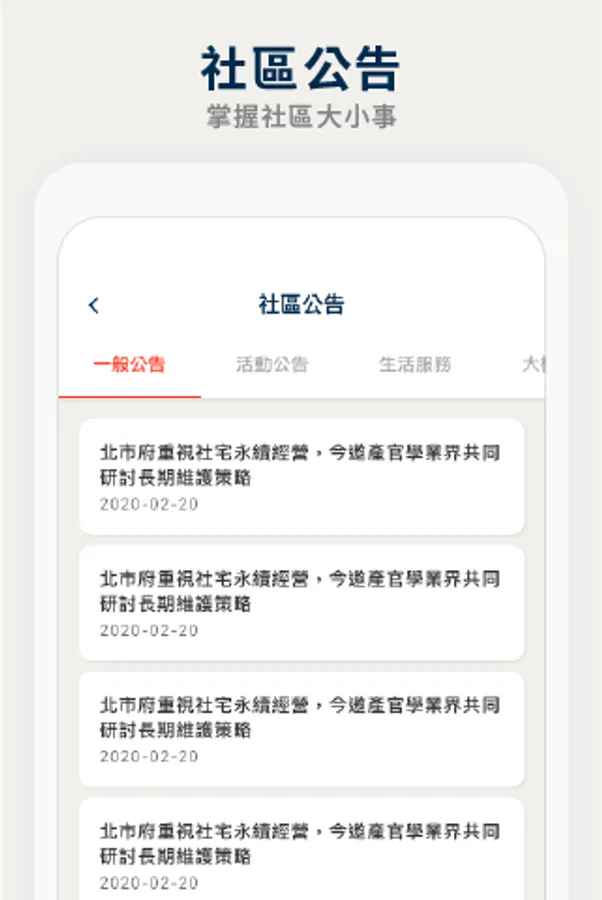 The Taipei City Social Housing online service is available for social housing tenants. You must have a Taipei Tong Gold membership account and a tenant who has rented social housing to log in. The service content includes functions such as community announcement, online repair report, opinion feedback, and online payment. Tenants can apply for residential repairs, payment inquiries, email notifications, etc. through the APP, and can be informed about the latest community news and various service notifications at any time.