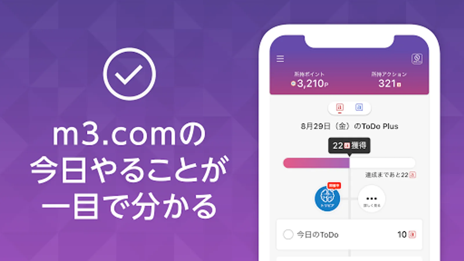 m3 ToDo Plus is an app that allows you to see at a glance what you are doing today at m3.com, Japan's largest medical specialty site.