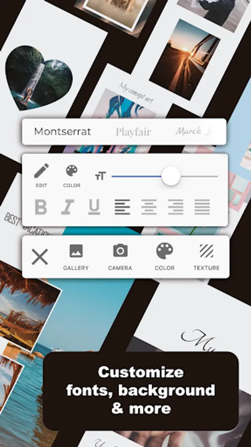 Customize the background of your story. Choose templates from our gallery. Get nice fonts to edit your texts, combine photos and share it!