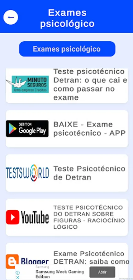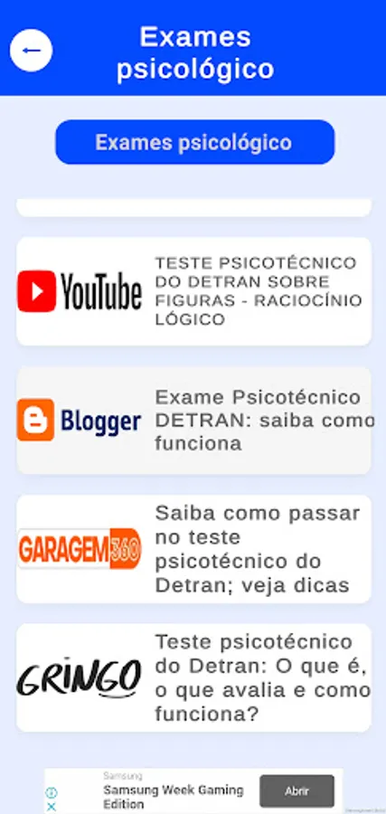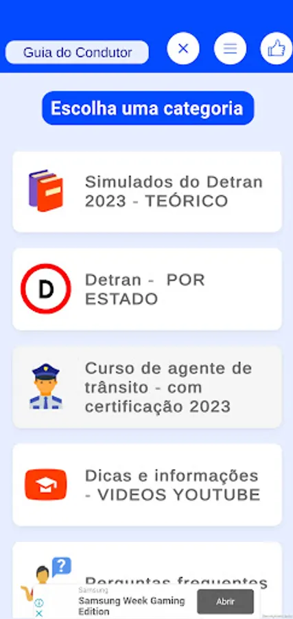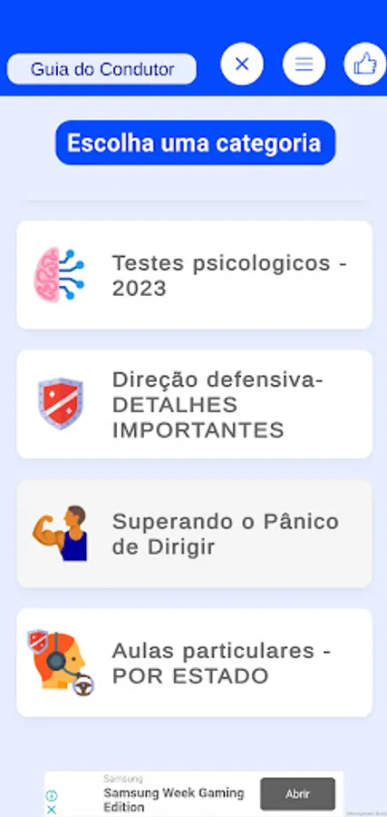 Driver's Guide is a free application that brings together several important sites for those in the process of obtaining a CNH. With it, the user has access to information and useful tips for studying and preparing for theoretical and practical tests, in addition to finding places to carry out medical and psychotechnical tests. The application is intuitive and easy to use, and helps to simplify the entire process of obtaining a driver's license. Download now and have all the important information at your fingertips!