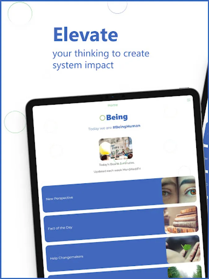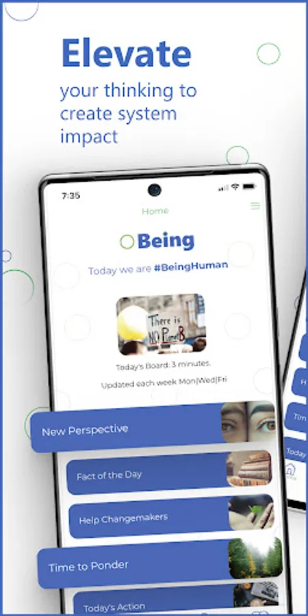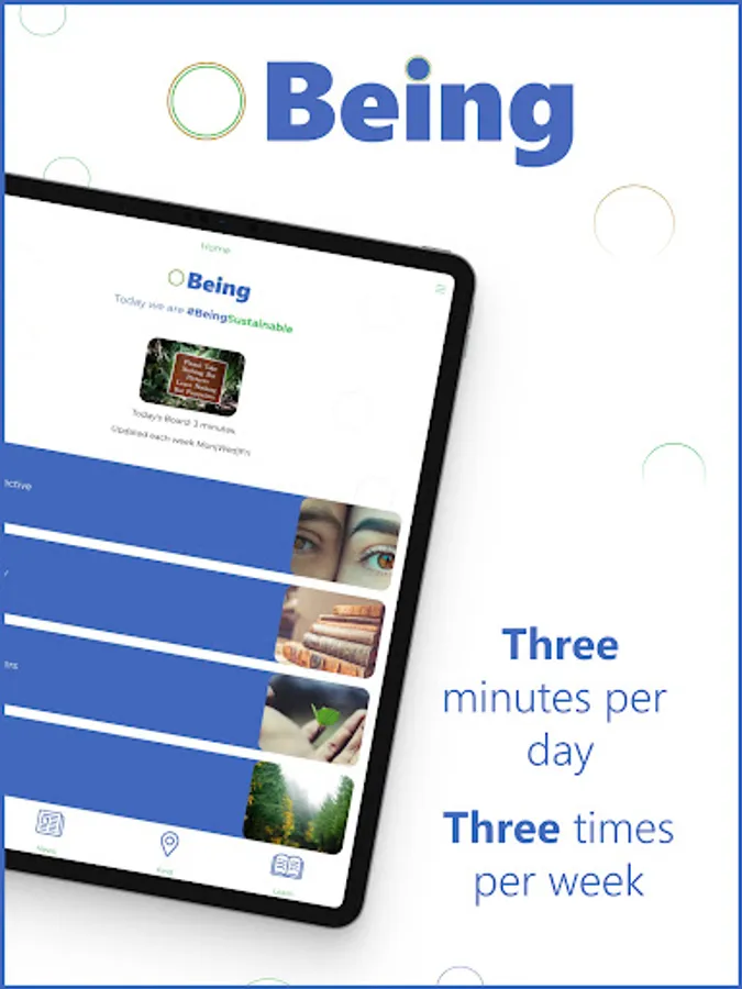 Being is the leading critical thinking app that elevates the world’s zeitgeist towards climate action and positive system change. It will take new perspectives, systems thinking, and paradigm shifts for us to solve our most complex challenges such as climate change and biodiversity loss. The Being app brings this to you in a simple, digestible, and actionable manner. All in under three minutes per day, three times per week.