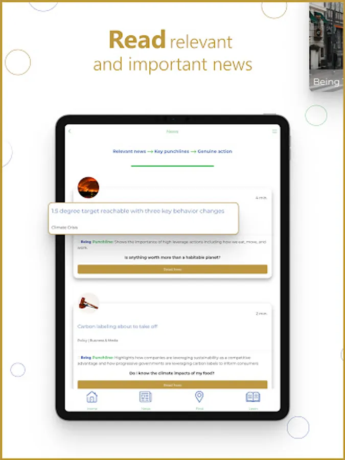 Being is an app for changemakers, like you. Changemakers that are ready to roll up their sleeves, take control, and make a real sustainability, climate, and system impact. It all starts with thinking critically about how we eat, consume, move, vote, and work, and then taking deliberate action. We make this easy for you.