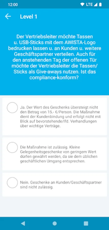 The AWISTA app "eLoerni" is an internal learning app for employees of AWISTA GmbH. In the form of multiple choice questions, topics such as occupational safety, health protection or compliance are treated in an easily understandable way. New content can be brought to the employees quickly and easily. For the successful participation in the electronic learning program the respective participant receives a certificate.