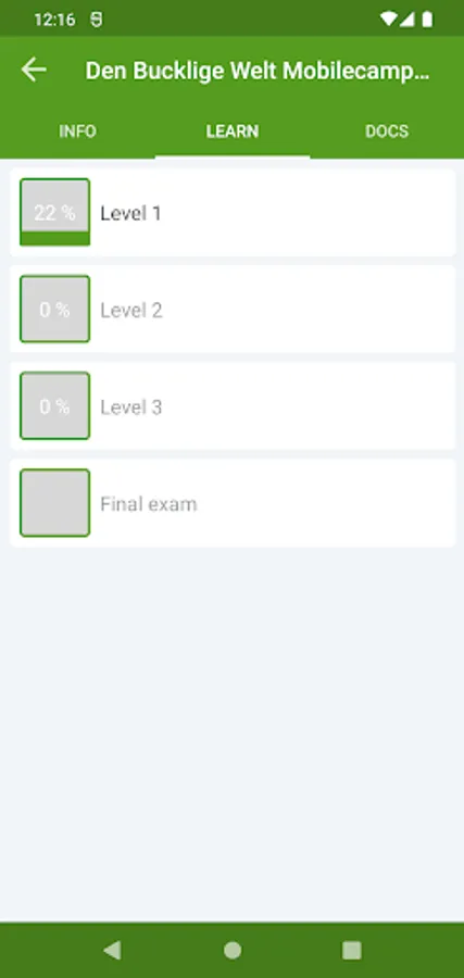 In addition to classic learning, level learning is also offered. In level learning, the system divides the questions into three levels and asked them at random. There is a break between the individual levels in order to save the content in the best possible way. This is necessary in order to achieve sustainable knowledge acquisition. A final test makes the learning progress visible and shows where possible deficits lie and, if necessary, a repetition is useful.