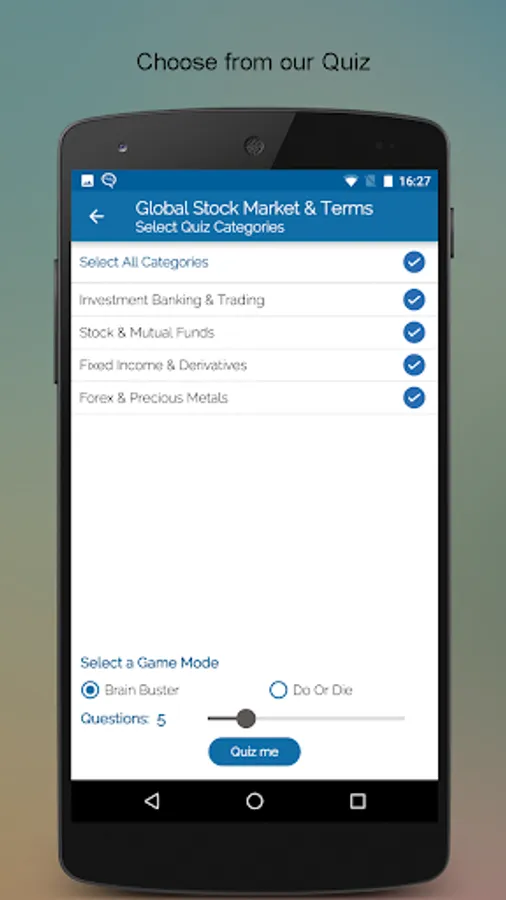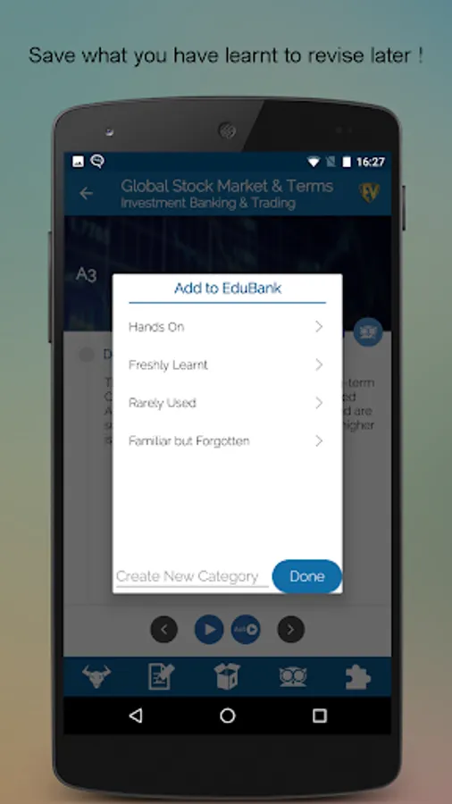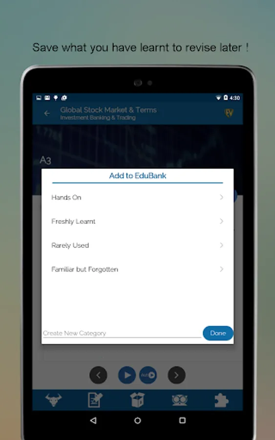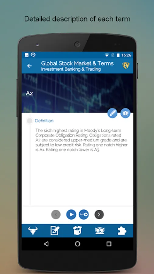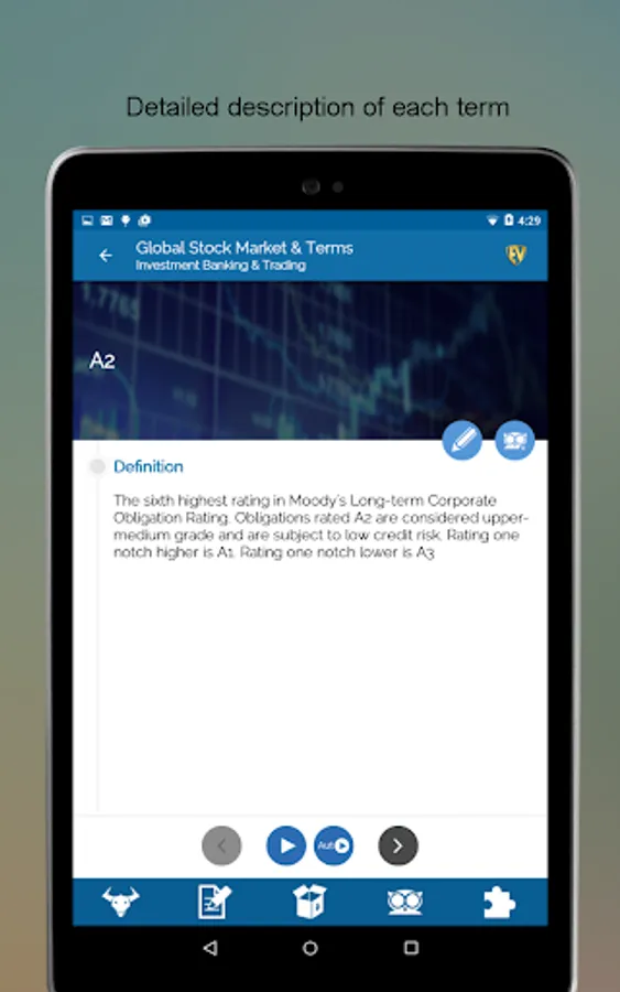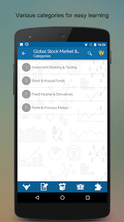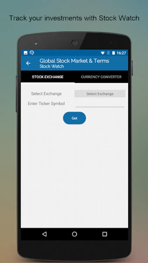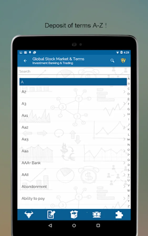 Global Stock Market & Terms is a one stop junction for stock watch and terms related to stock market. With more than 5000 Stock Market Basics terms, you will never get baffled with the jargons used by stock brokers nor will stock exchange abbreviations ever scare you. Make smart investment at the stock market with this SMART Stock Market Learning App. This app is full of interactive Quizzes to brush up your knowledge and challenge your learning.