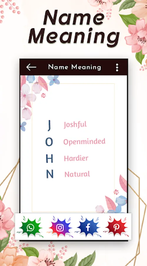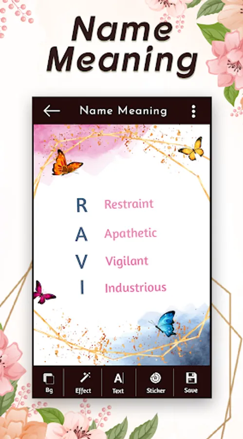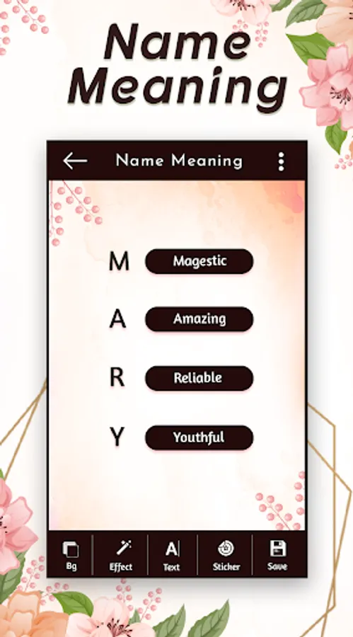 My Name meaning Application helps you to check what is behind your name and make a picture with any theme you can choose your loved theme and put your name with many other graphics tools like you can increase the font size, font style, color, etc.