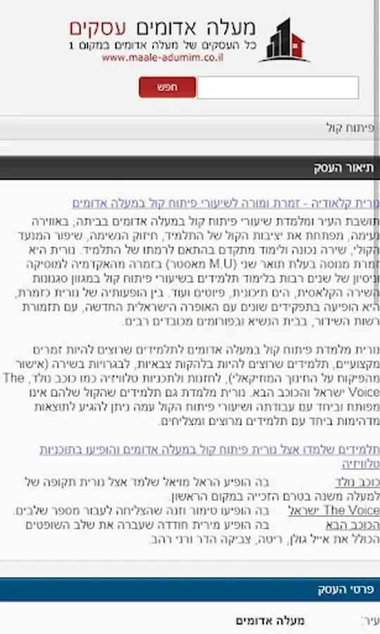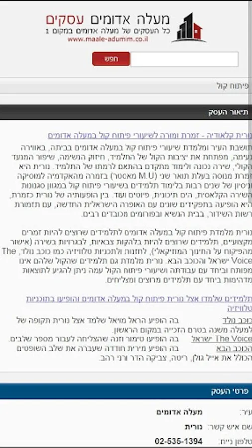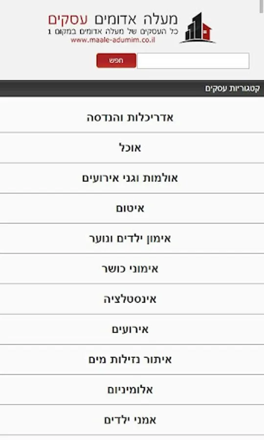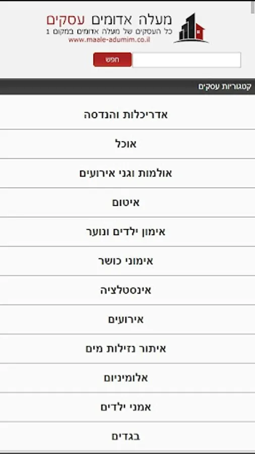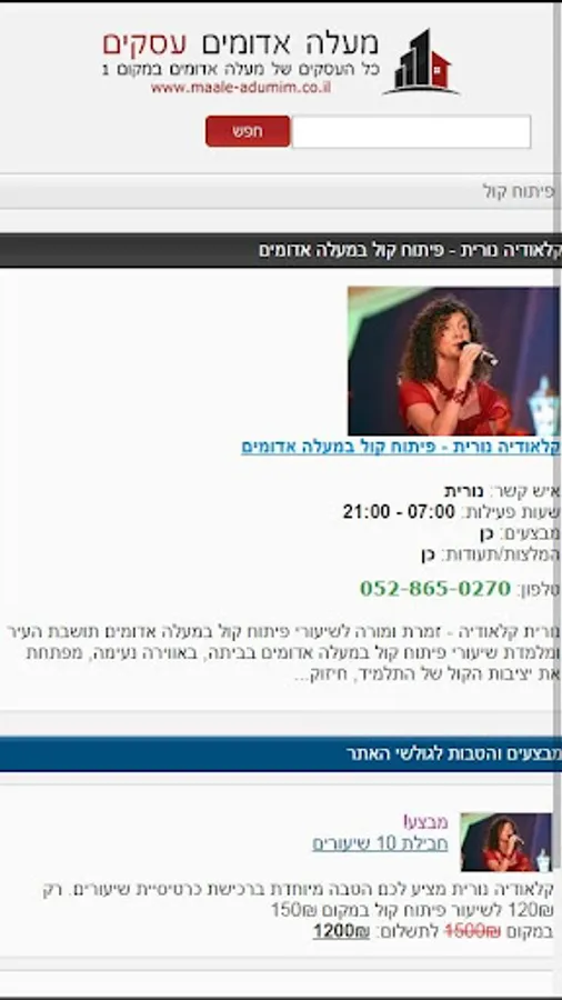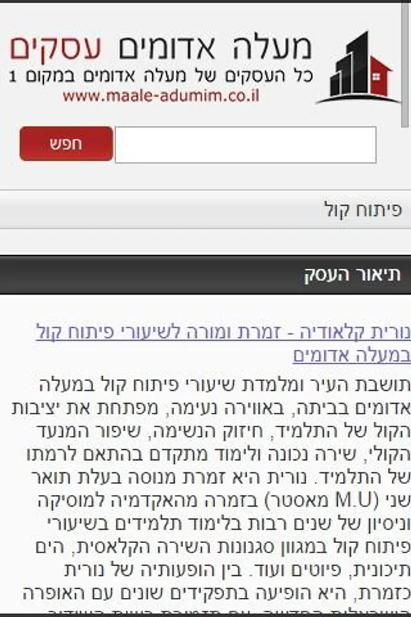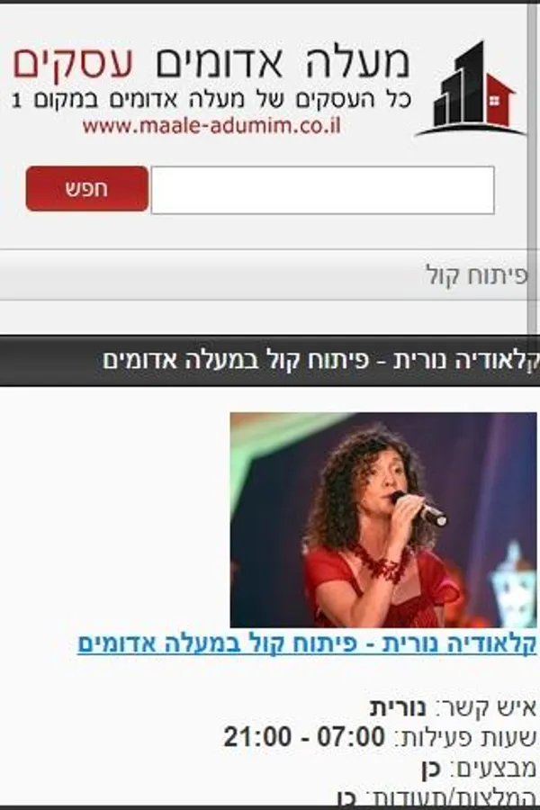 Ma'ale Adumim business is a website and an app that specializes in presenting business information Ma'ale Adumim. Upon receipt of a business site data for each business are presented in detail including the name of the business, a detailed description and information about the business, products and services it provides, contact name to call a business, phones, photos for illustration, offers and coupons available to residents of Ma'aleh Adumim to come through site This website or application, details of working days and hours of operation, map to the business, certificates, testimonials and more.