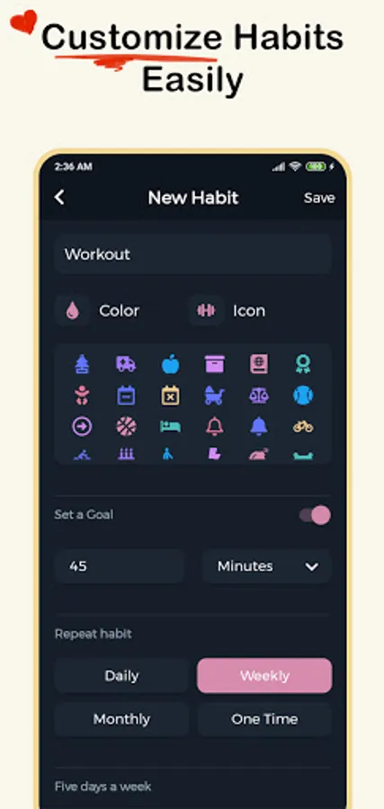1. Daily habits: For example, 'Make your bed' It's a daily habit you need to do every day or you can select specific days in a week you want to do that habit, for example, you want to do it only each Saturday and Sunday.