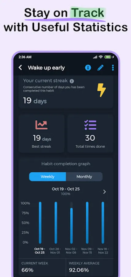 You can also set general reminders to get information about the habits you need to do at the beginning of every day at a specific time you set. Also, you can set a reminder at the end of each day to show your achievements every day.