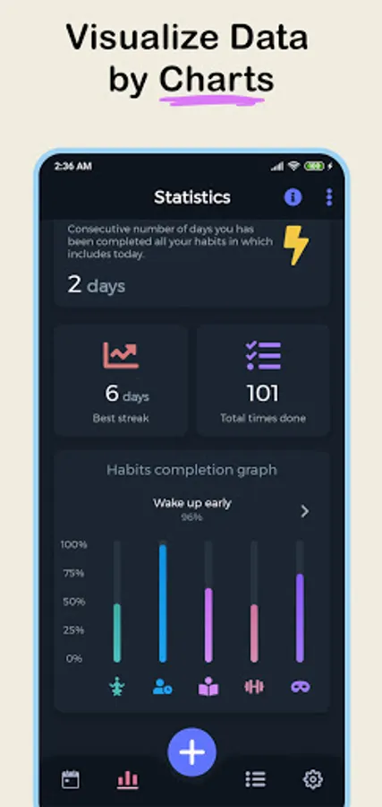 With a beautiful interface, Habit360 helps you to clearly see how your habits improved over time with detailed fancy charts and statistics. Use characteristics and charts to reveal your strong and weak sides.