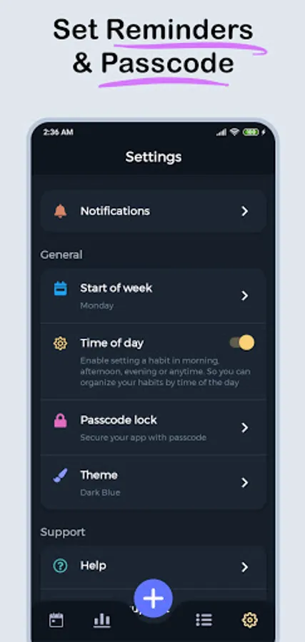 We care about your sensitive data! Keep your habits and your progress away from curious eyes with a passcode lock.