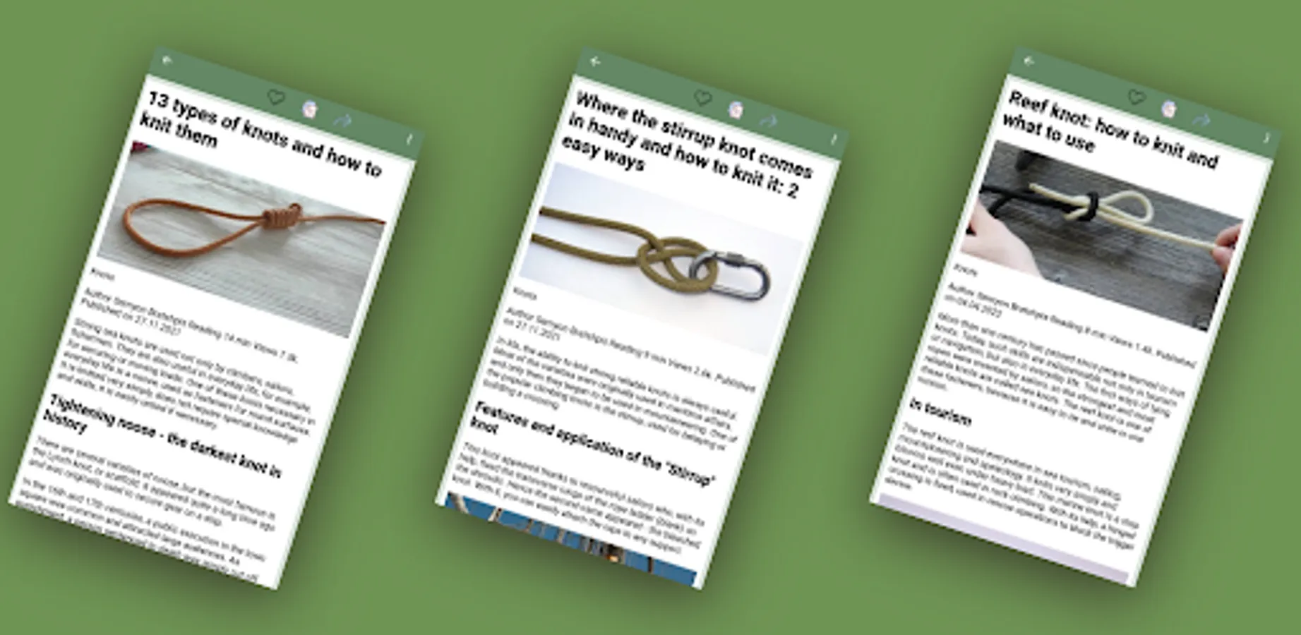 You can use our application without internet and anywhere. Tightening knots and useful knots are also featured in our guide. Our app will also help you learn how to untie knots if needed. You will be able to choose a suitable knot for the rope and learn how to knit it so that it holds securely.