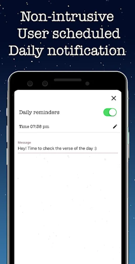• Non-intrusive, user scheduled, daily notification of your scripture