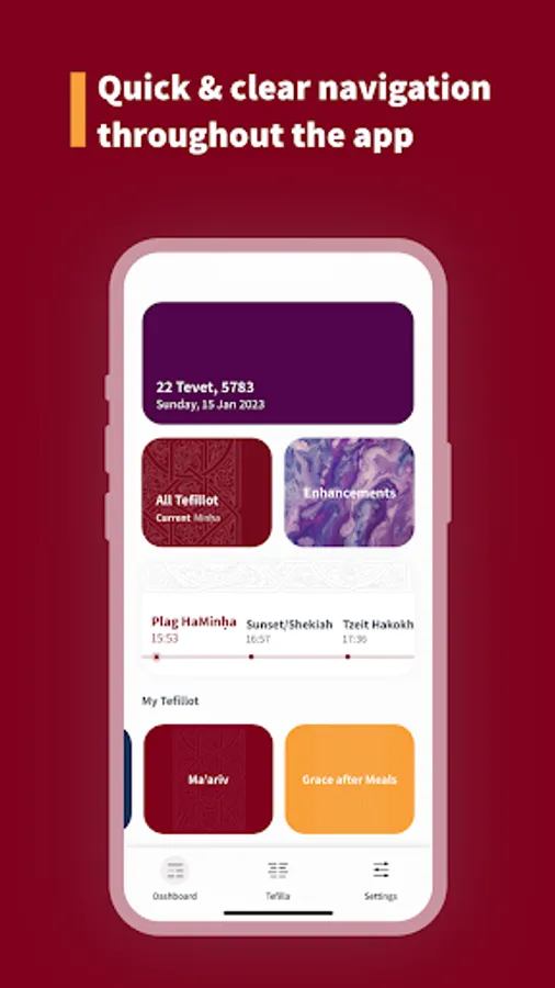 The siddur is of course a smart siddur and therefore displays the appropriate tefillot based on the annual cycle. In addition, one may apply different tefilla modes such as davening with a minyan, ḥazzan mode, simḥa and aveilut as well as geographic location.