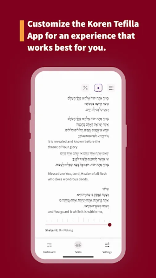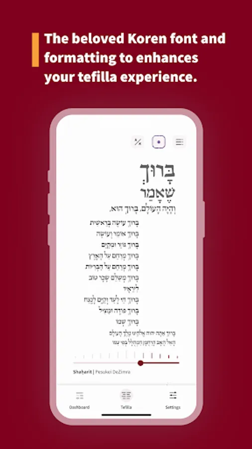 The siddur was designed in accordance with the design elements which were created by Eliyahu Koren and which have been passed down at Koren Publishers over the last 60 years. We have done our best to maintain these guidelines while making the necessary changes considering the platform.