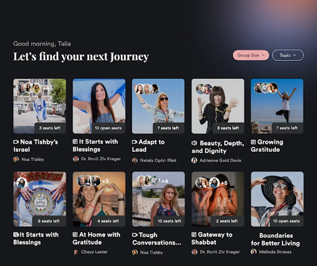 Each Journey features high-value, original, immersive Jewish learning – including videos, audio, readings, and interactive exercises – from Jewish educators and experts like Lori Palatnik, Noa Tishby, Kelly McGonigal, Zohar Raviv, Chaya Lester, and Adrienne Gold Davis.