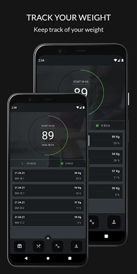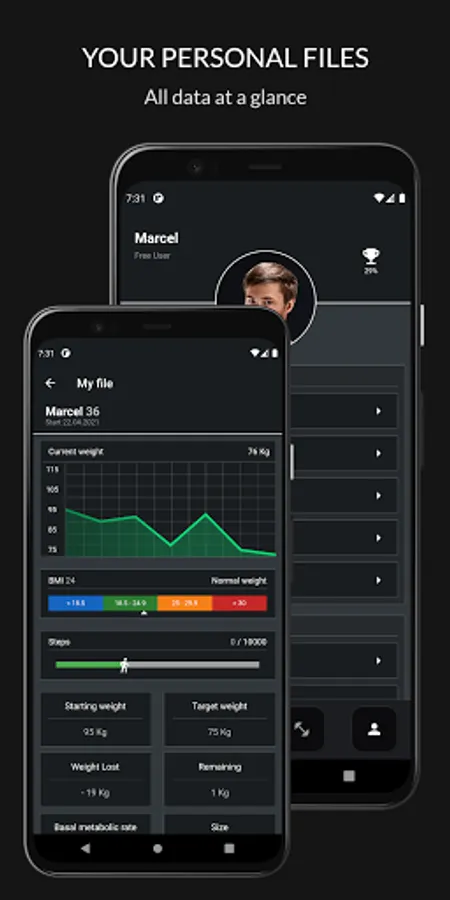 Your app for fitness, weight loss, muscle building, calorie counting and knowledge, enter your basic data and select a mode e.g. lose weight, keep weight and get fit or build muscle. The fitness app always uses the latest data you've entered to make scientifically correct calculations to suit you, so you always get the right calorie count, BMI and more!