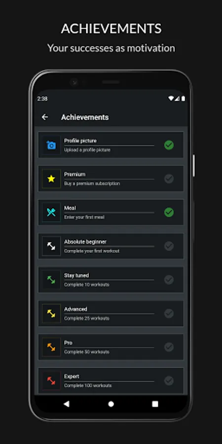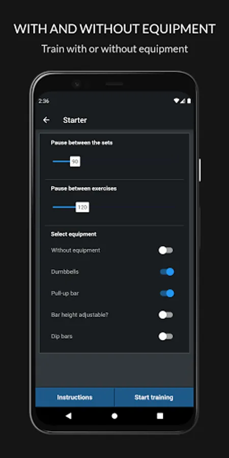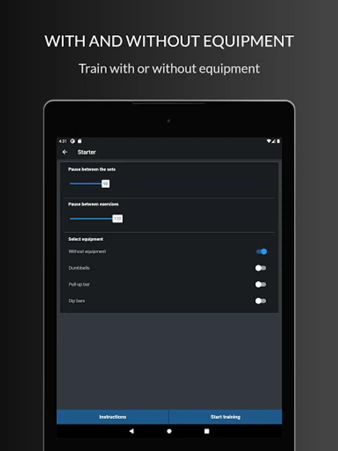 In the workout section you choose one of 7 fitness workouts, you train where you want without any equipment, but you can choose the equipment you have available, e.g. dumbbell, pull-up bar or dip bar, your training plan is automatically adjusted so that you can train anywhere and anytime, everyone trains at their own level! If an exercise is too difficult, simply select an easier variation until you master it.