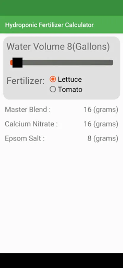 The fertilizer calculator uses the mixing instructions provided by the MHPGardener Youtube channel for both Tomatoes and Lettuce. It uses Masterblend 4-18-38 Tomato fertilizer as its base, and also requires Calcium Nitrate, Magnesium Sulfate (aka Epsom Salt), and water. Changing the quantities allows the same four ingredients to make nutrient solutions for both Tomatoes, and Lettuce, as well as other plants. You can use the nutrient solution provided by the calculator to grow vegetables using the Kratky Method, or any other type of hydroponic growing method.