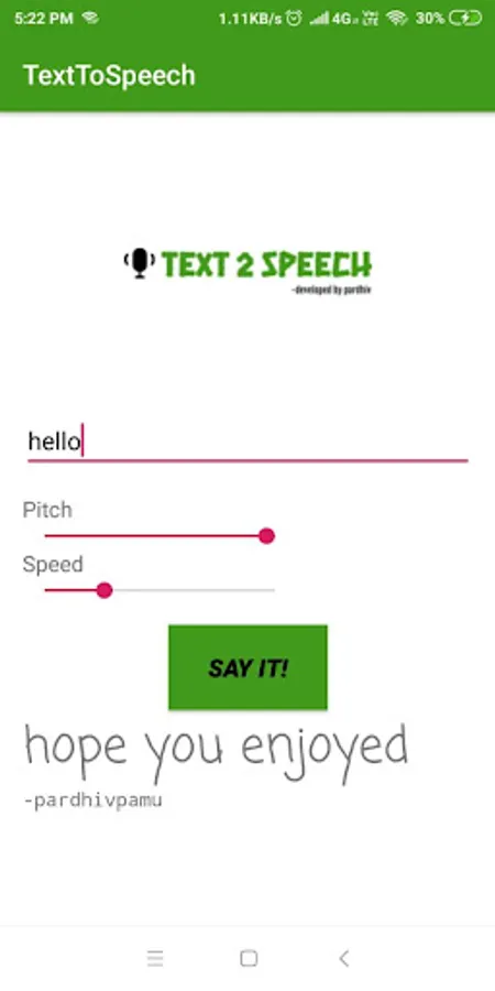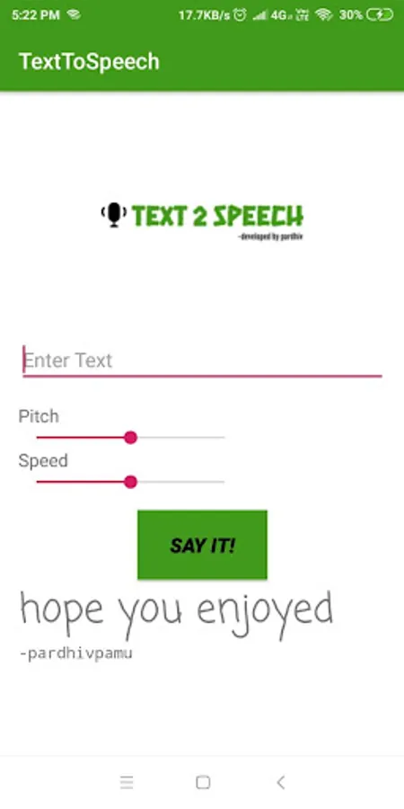this app has an edit text in which you can type what you want to speak and you can also adjust the speed and pitch of the voice that you want to speak