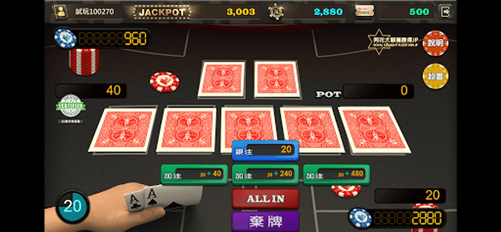 Texas Hold'em one-on-one PK mode!