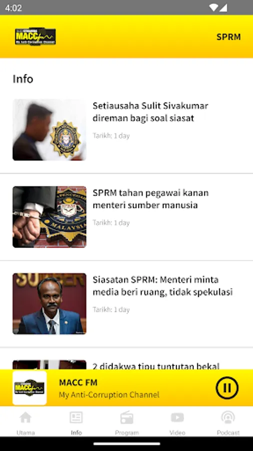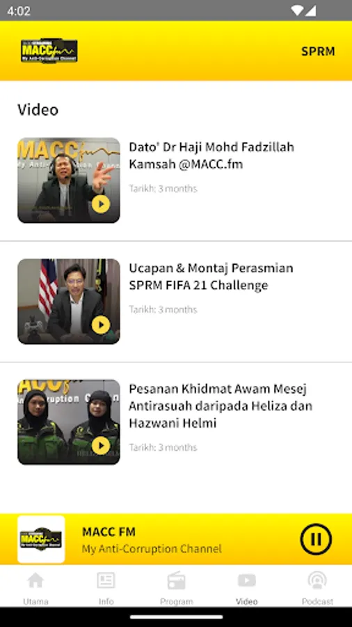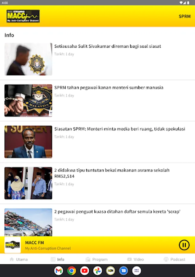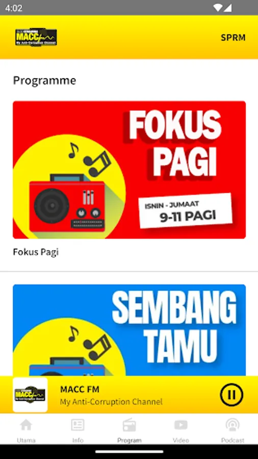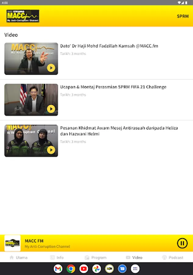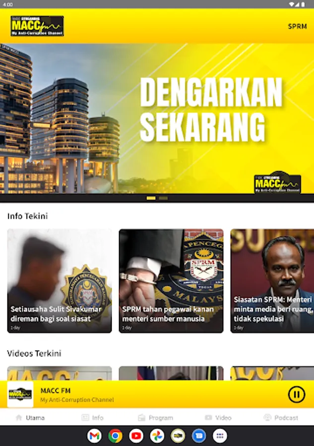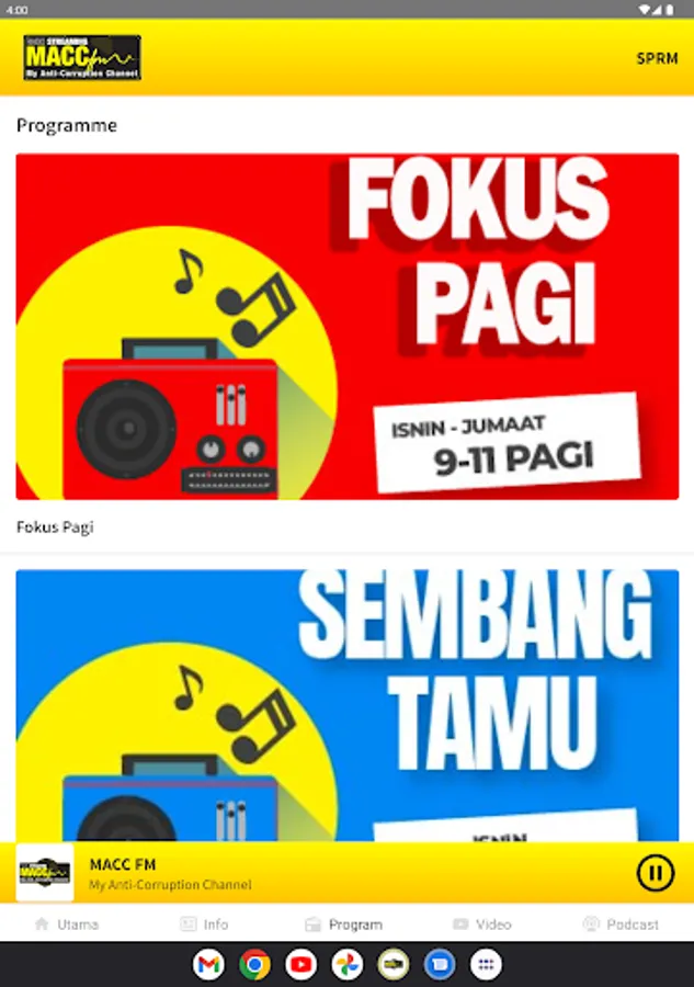 MACCfm.my is Digital Media Community Platform by Malaysia Anti Corruption Commission. The application streams radio program from MACCfm Radio Studio, publishes community news, upcoming activity, video and podcasting that related to Anti-Corruption and Malaysia Community.