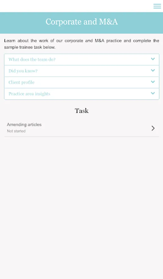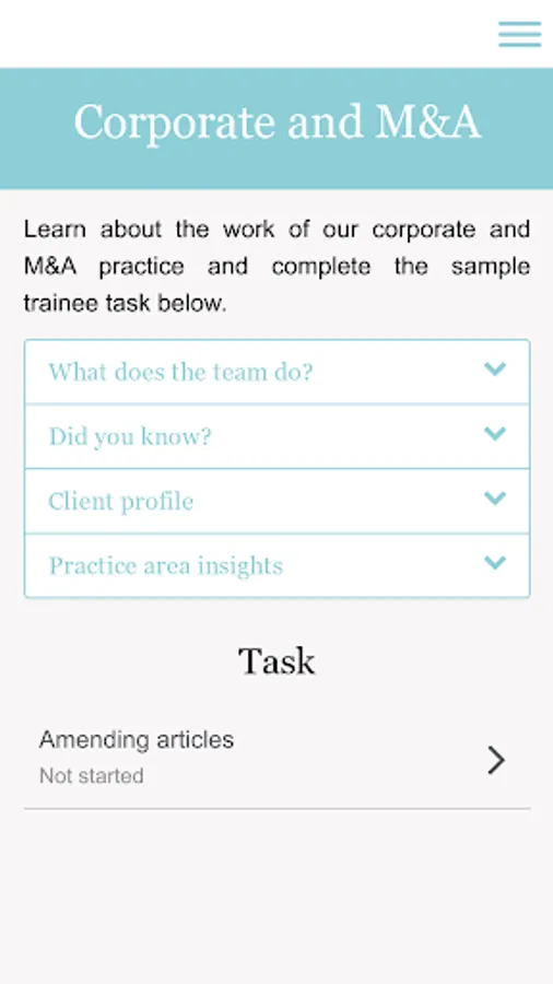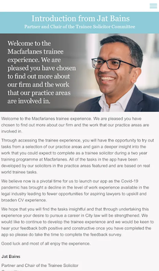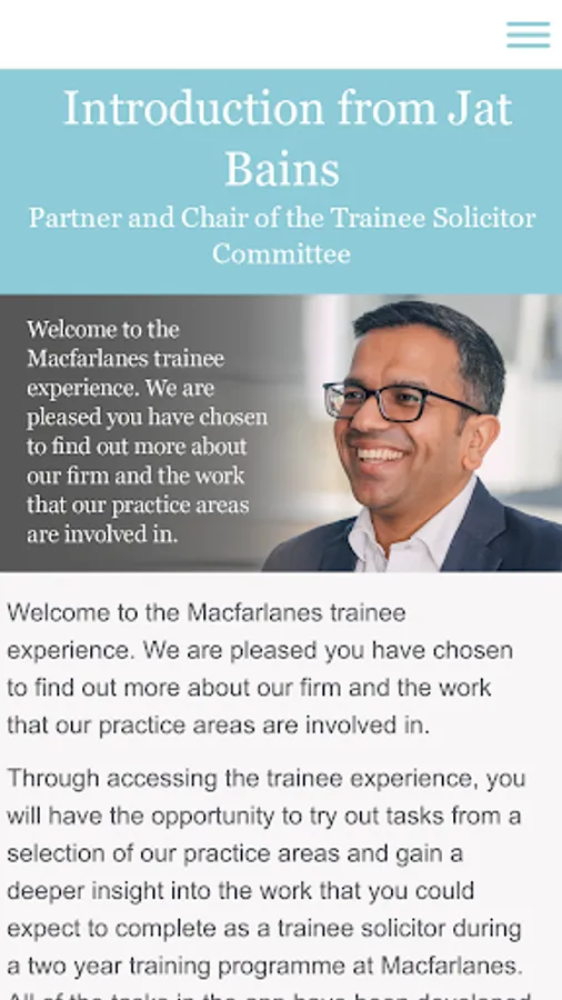 The programme has been developed in-house, and all tasks have been modelled on real work and created by our associates and trainee solicitors. The app will allow you to experience work from our corporate and M&A, finance, litigation and private client teams.
