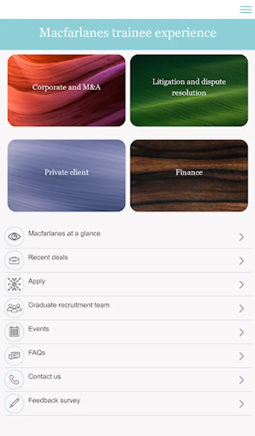 Upon completion of the Macfarlanes trainee experience you can sign up to attend one of our virtual webinars where our solicitors will run through their task from the app in more detail. These are an excellent opportunity to consolidate everything you have learnt and ask any follow up questions.