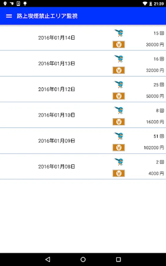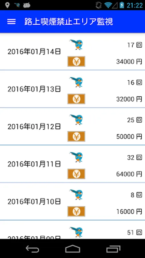 ・日毎に路上喫煙禁止エリア内の回数、過料を記録します。