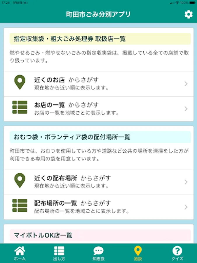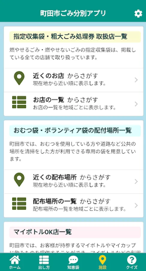 You can check facility information and maps that include distribution locations for diaper bags and volunteer bags, dealers selling designated collection bags and oversized garbage disposal tickets, base collection locations, recycling plaza venues, etc.