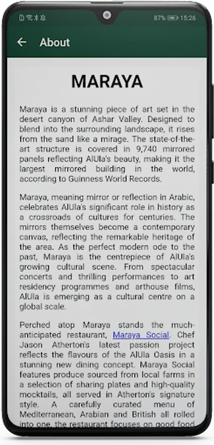 This mobile application is used to navigate inside Maraya Building facilities and events by giving directions on live map and supporting voice.