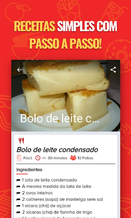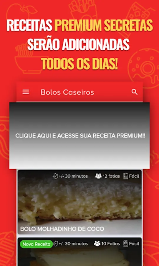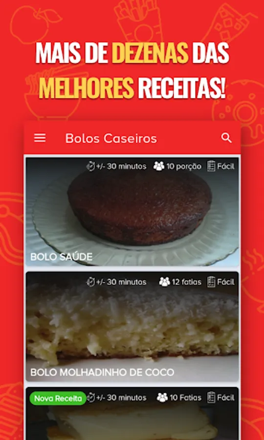 The homemade cake app contains several recipes, such as homemade cake to sell, easy to prepare at home. There are homemade cake recipes, chocolate cakes, strawberry cakes, cake with icing, blender cake, and we don't have fat test, etc. Also, new recipes will be added every week!