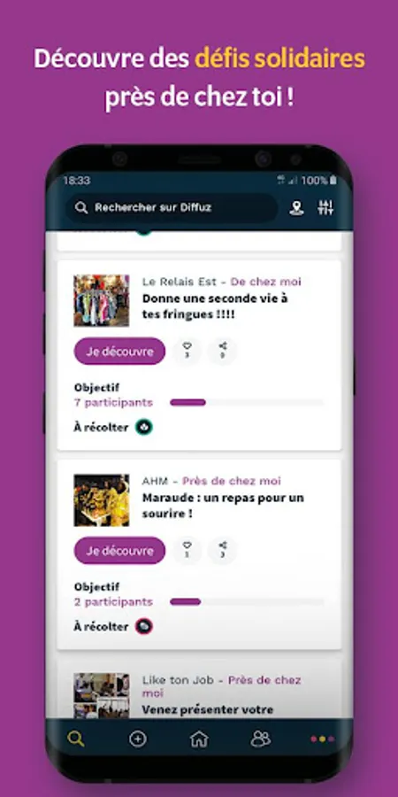 Discover challenges everywhere in France and act on the ground in contact with associations or at home. Too busy a schedule? No worries, with Diffuz you can commit from one hour to a day and devote the time you want to solidarity.