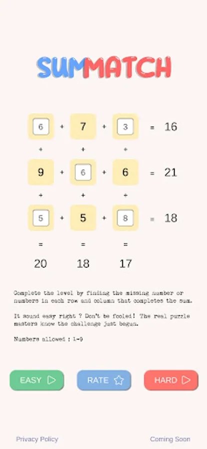 SumMatch is designed to engage, entertain, and elevate your cognitive prowess. At its core, it offers a compelling puzzle-solving experience where players are tasked with completing 3x3 grids by strategically placing missing numbers to match each row and column sum.