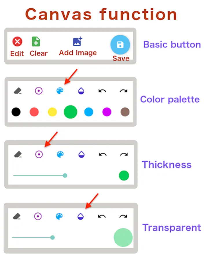 It is equipped with free drawing, path resizing, color palette selection, transparent color setting, eraser function, back and forward buttons, etc. with just a tap.