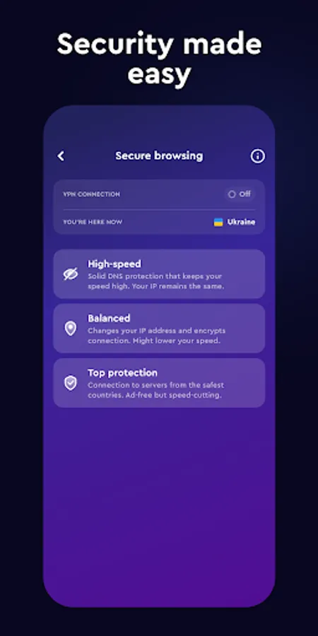 Make your digital life safe, private, and comfortable with a VPN made in Ukraine. With just one tap, you can instantly protect your online connection, change your IP address location, or explore more online content.