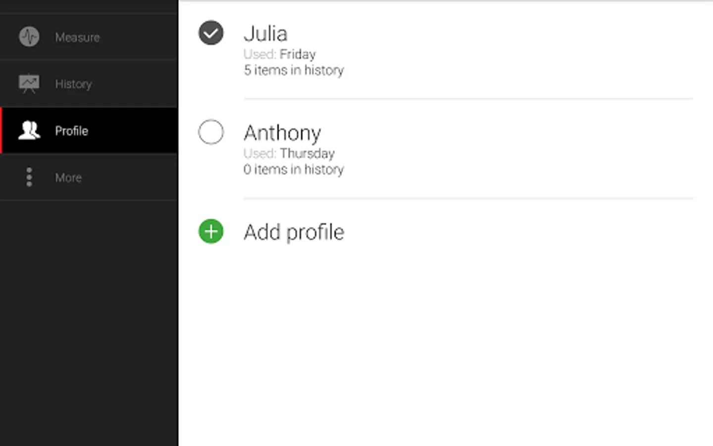 Cardiograph is perfectly tailored to allow multiple people to use the app on a shared device. You can create profiles for each of your family members or friends, and each of them has their own individual measurement history.