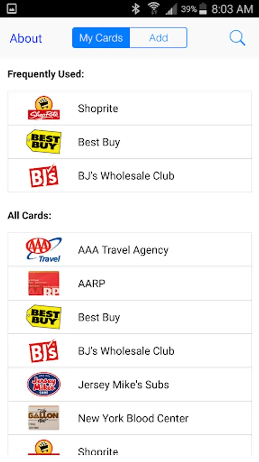 Once added, the app keeps track of usage and provides a frequently used section plus an alphabetical list of all your cards. Just tap the card and scan at checkout. Nothing complicated.
