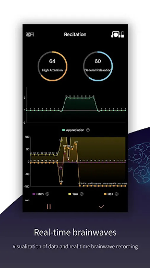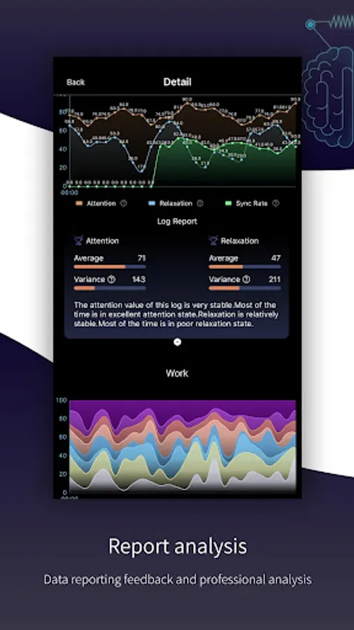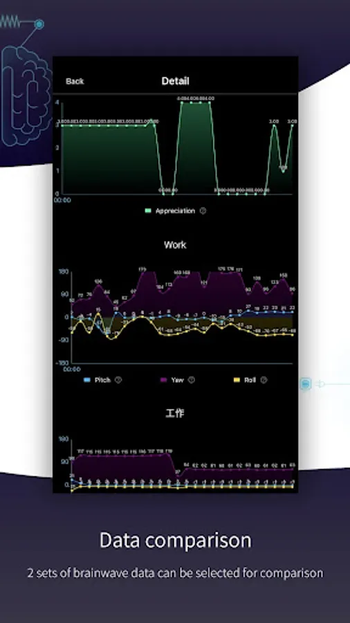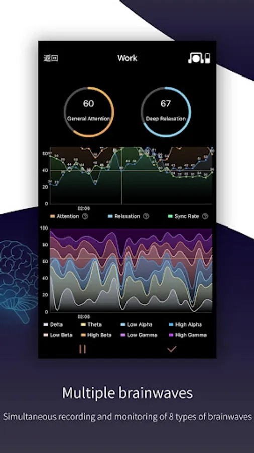 Basic detection is an application which helps users to record and save the real-time brainwave data, it can also display the most important Delta, Theta, Alpha, Beta, Gamma and other 8 kinds of brainwave frequency. Whether you’re learning, working or you want to record your attentive/relaxed state when doing certain things, you can use it to record your brainwave in a real time, so as to help you make adjustments and improvements. Not only that, it can also set comparisons with saved data so that you can understand the brainwave changes when you’re in different condition. It is a brainwave recording tool combined brainwave data collecting, analyzing with recording, which suits for white collars and students to recording the focus and relaxed states while working or learning. This application requires the wearing of a brainwave device BrainLink headband, it can detect the raw brainwaves in the left frontal lobe of your brain.