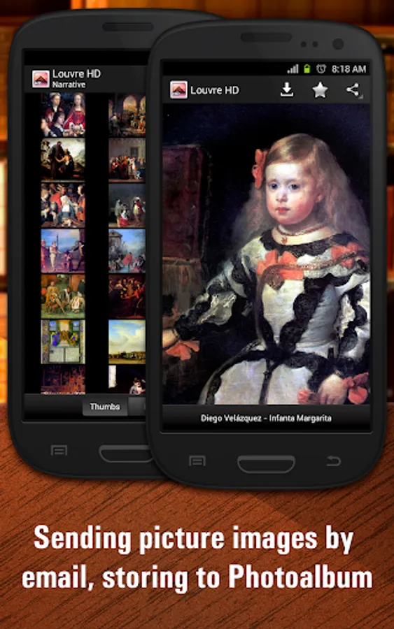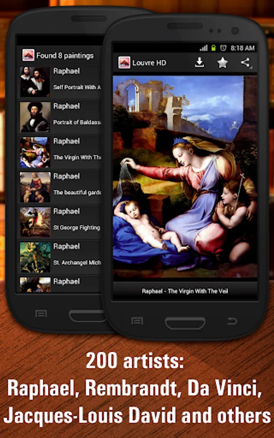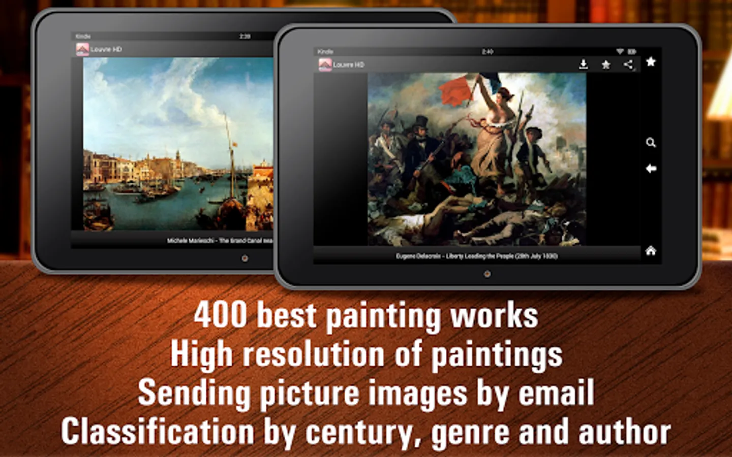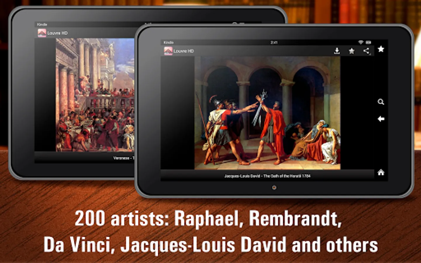 The application contains a collection of 2300 paintings of the Louvre Museum. Here you will find the works of Raphael, Rembrandt, Da Vinci, Veronese, Delacroix and many other eminent masters of painting.