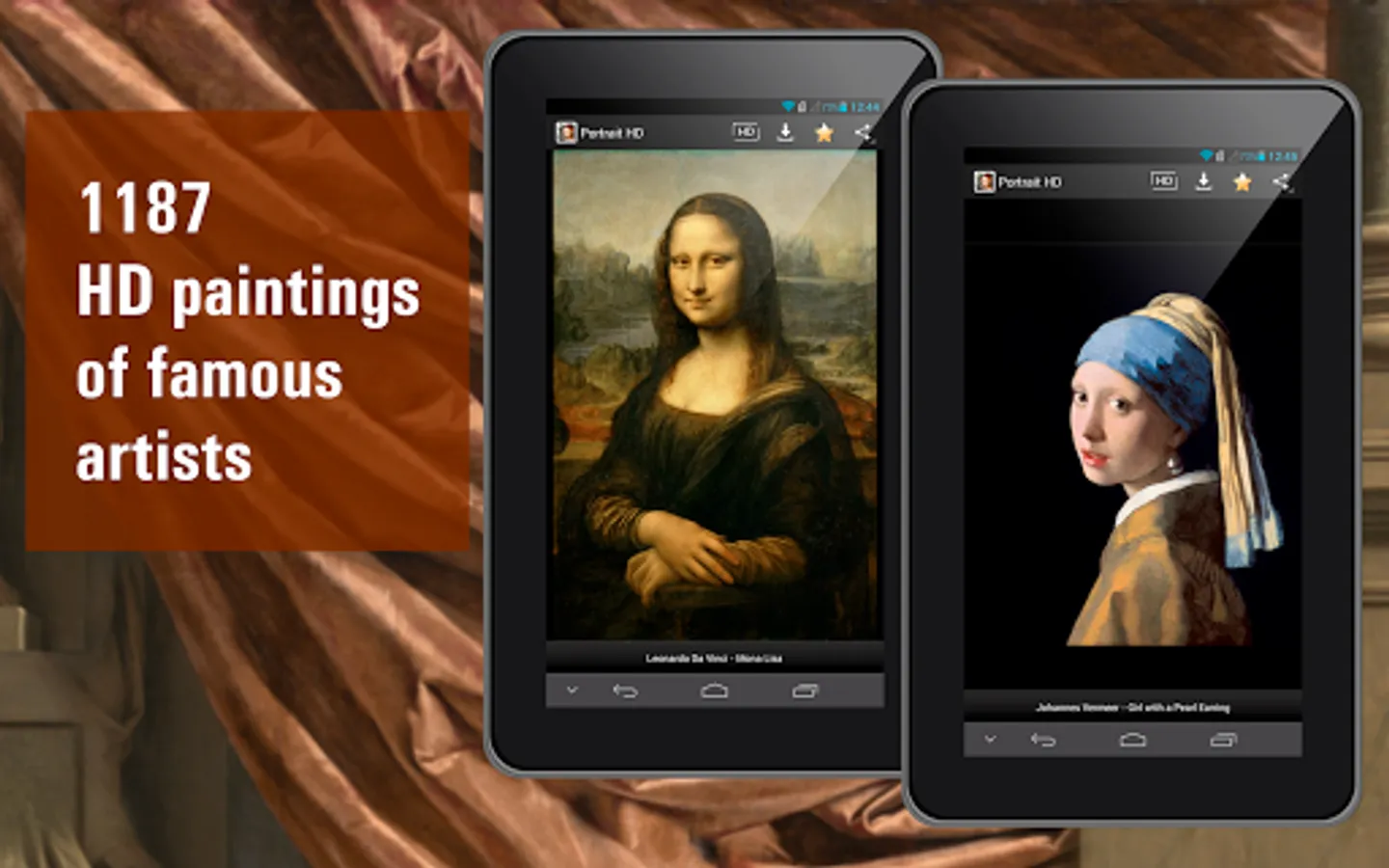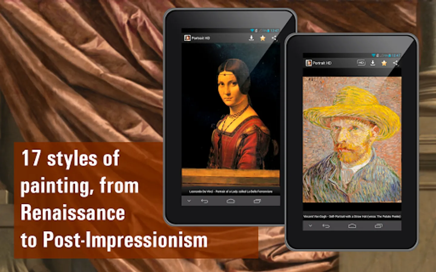 The “Portrait painting HD” has 1187 paintings, created by the greatest masters of all times representing time from Renaissance to Contemporary history. The most popular portraiture masters are: Leonardo da Vinci, Sir Anthony van Dyck, Vermeer, Diego Velasquez, Francisco de Goya, Jacques-Louis David, Vincent Van Gogh, Henri de Toulouse-Lautrec and others.