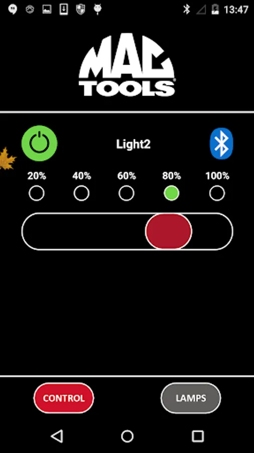 3. The Control screen allows the user to turn the light On/Off and adjust the brightness in 20% increments.