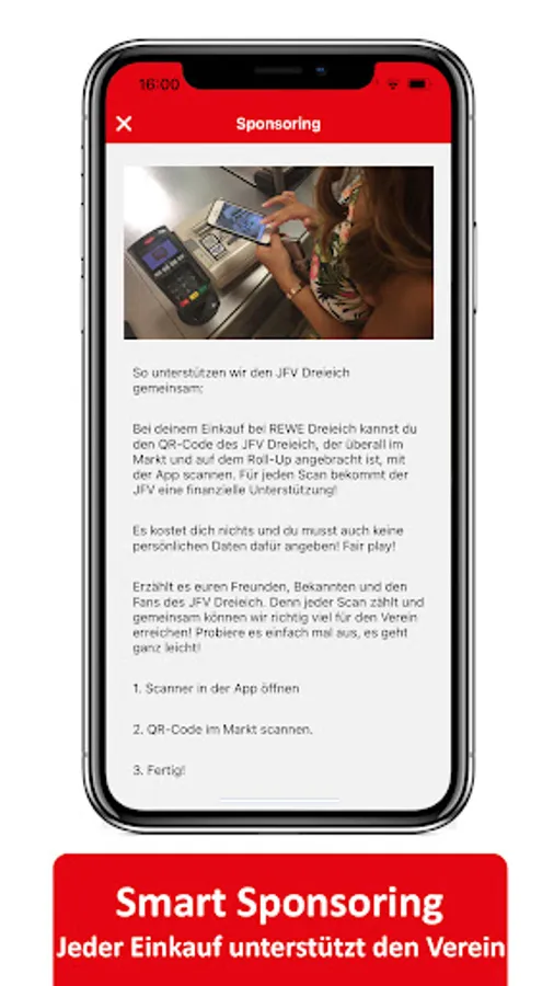 You can even support your club financially by scanning the QR code at the checkout using the integrated scanner when shopping at our sponsor REWE Gleisstrasse in Dreieich. At no additional cost and without providing any personal information!