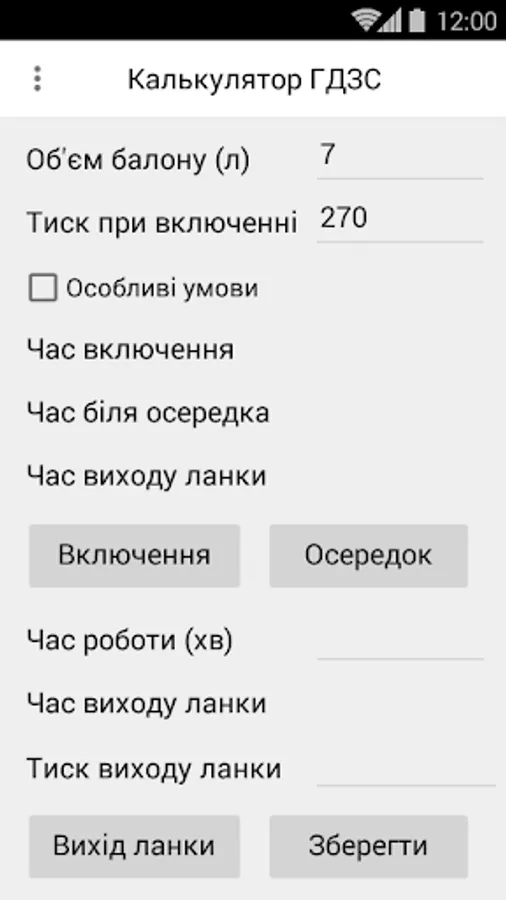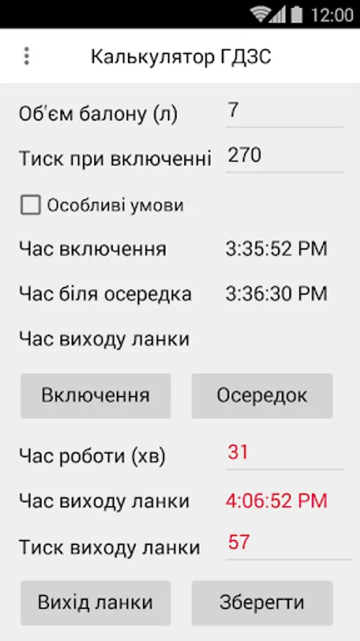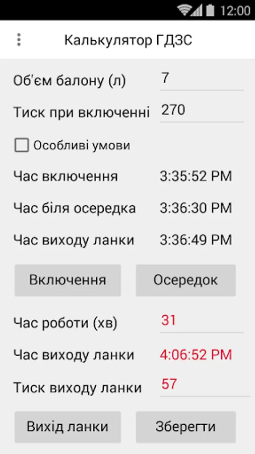 (calculations were made in accordance with the Order of the Ministry of Emergencies No. 1342 dated 16.12.2011 "Guidelines for the organization of gas-protective service in the units of the Rescue Service of Civil Protection of the Ministry of Emergencies of Ukraine".