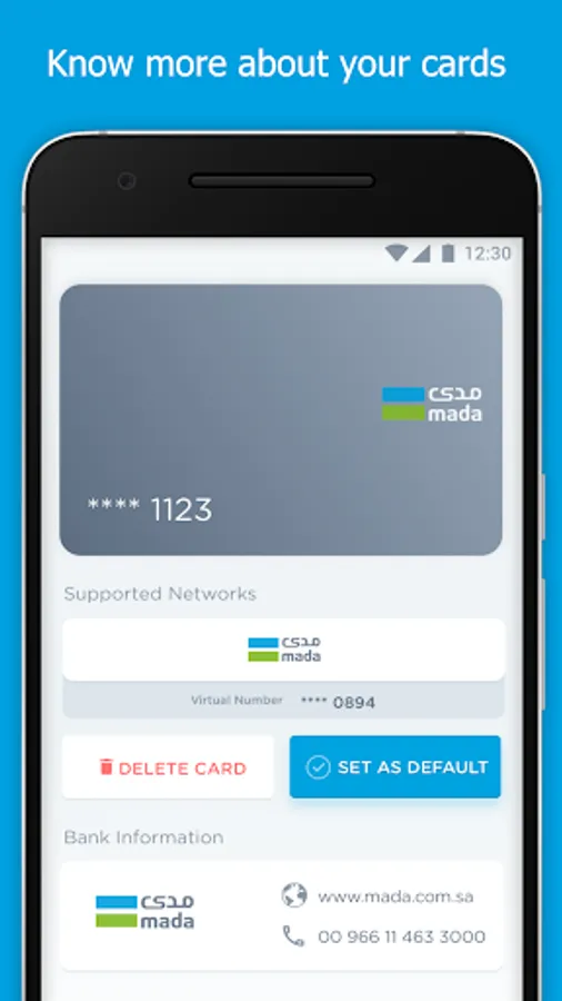 Paying at stores has never been easier, no need to pull out your wallet and look for the right card. With mada Pay, all your cards from any bank issued in the Kingdom can be found in one place. Pay everywhere you see mada atheer logo or the contactless payment symbol safe in the knowledge that mada Pay never shares your actual card number with the merchant so your card information remains secure.