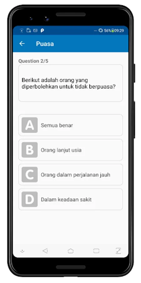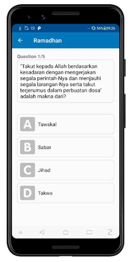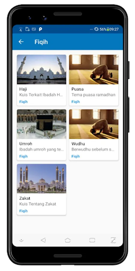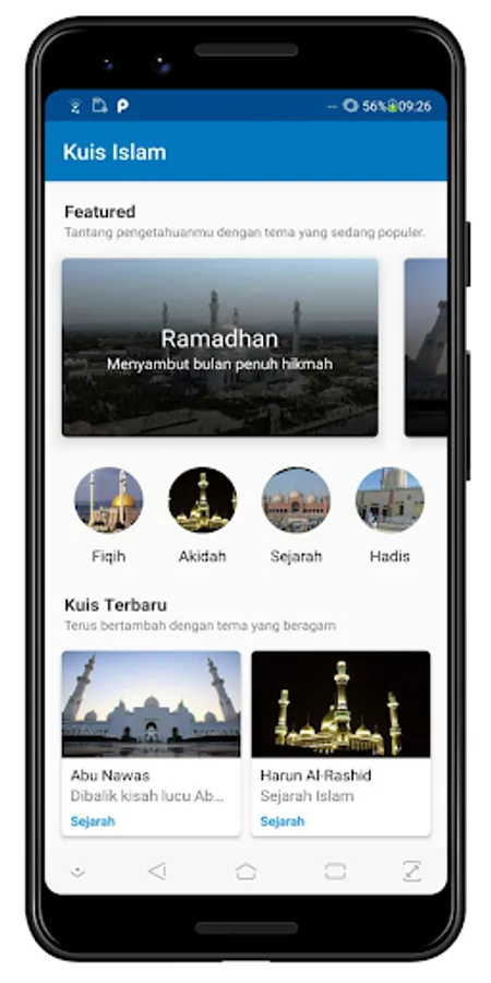 An application that contains a collection of quizzes about Islamic knowledge. Contains various categories, ranging from Fiqh, Morals, Hadith, and History.